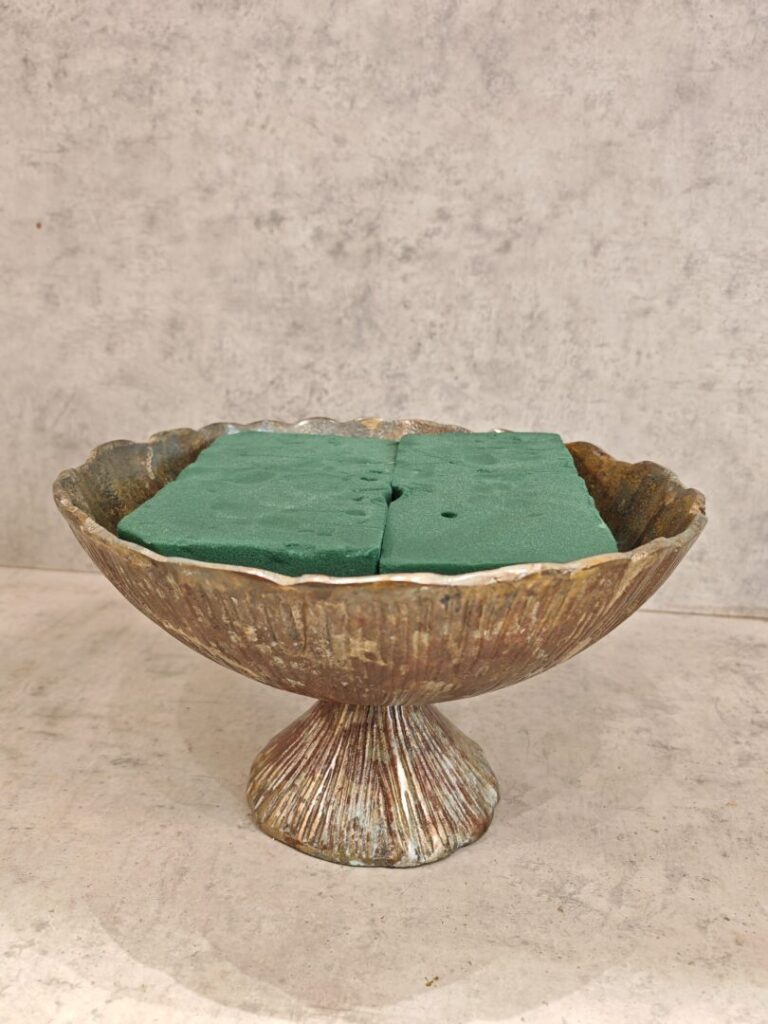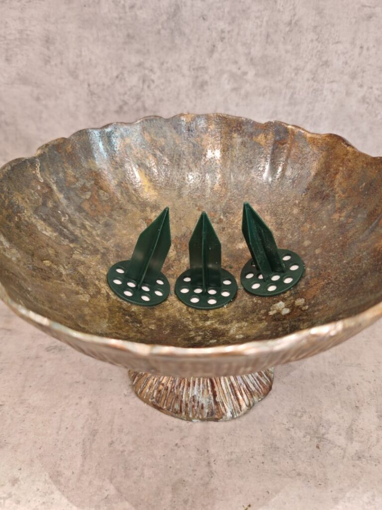 Do nádoby si prilepíme pini na aranžovaciu hmotu (príchytky). Zelenú aranžovaciu hmotu necháme napiť vodou, zrežeme ju podľa tvaru nádoby a vsadíme.
