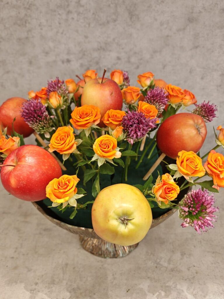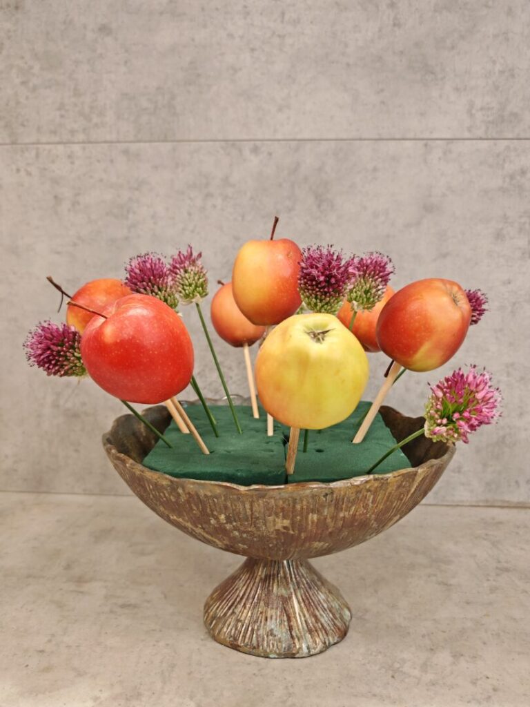 Ako prvé si jablká napichneme na špajle a rovnomerne ich rozmiestnime. Zapichneme kvety Allium. Ďalšie zakomponujeme kvety Rosa. Nezabúdajme sa držať tvaru, mal by byť okrúhly.