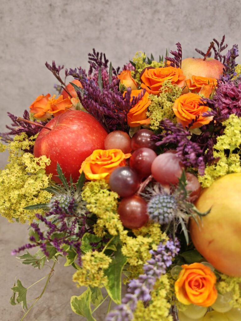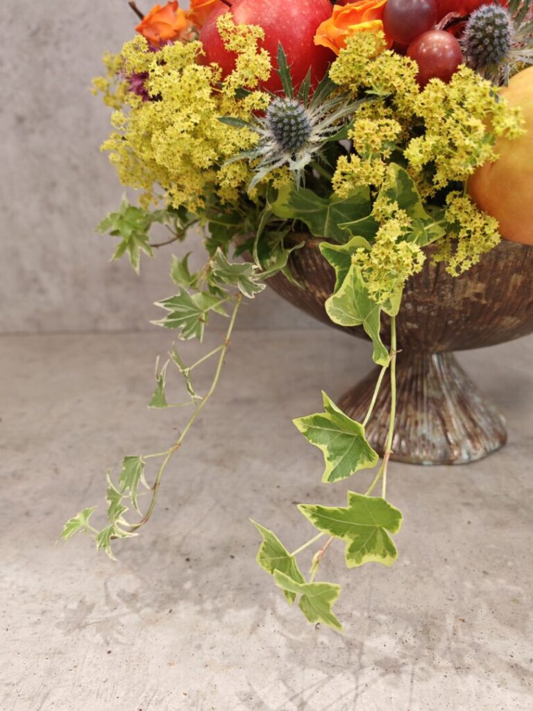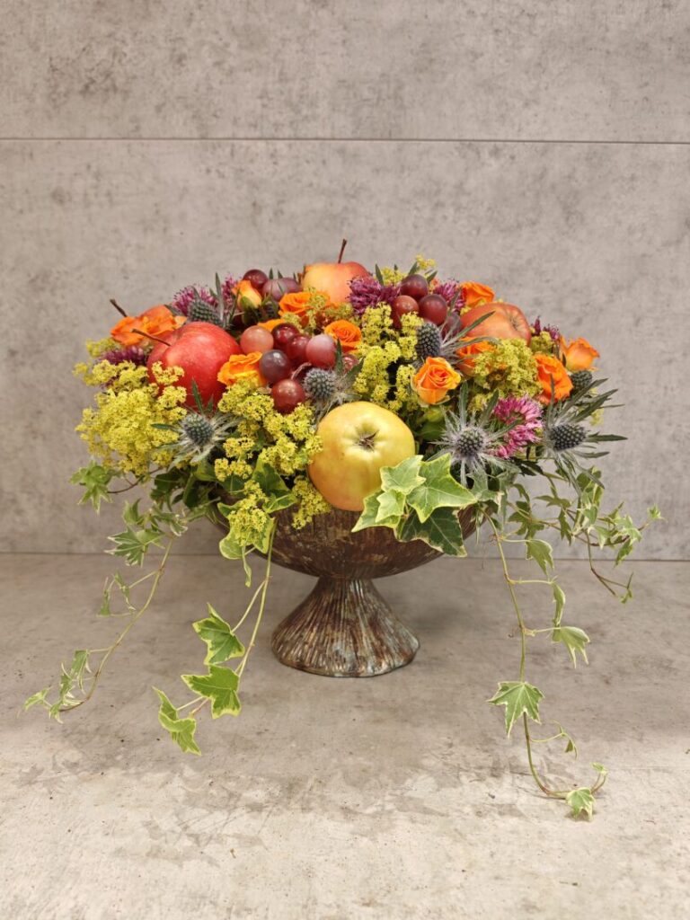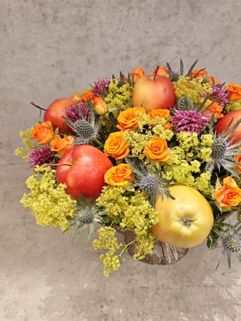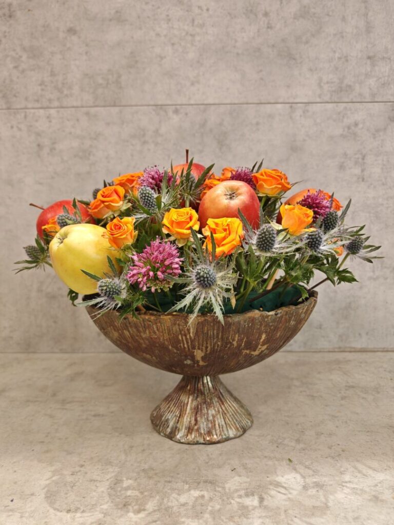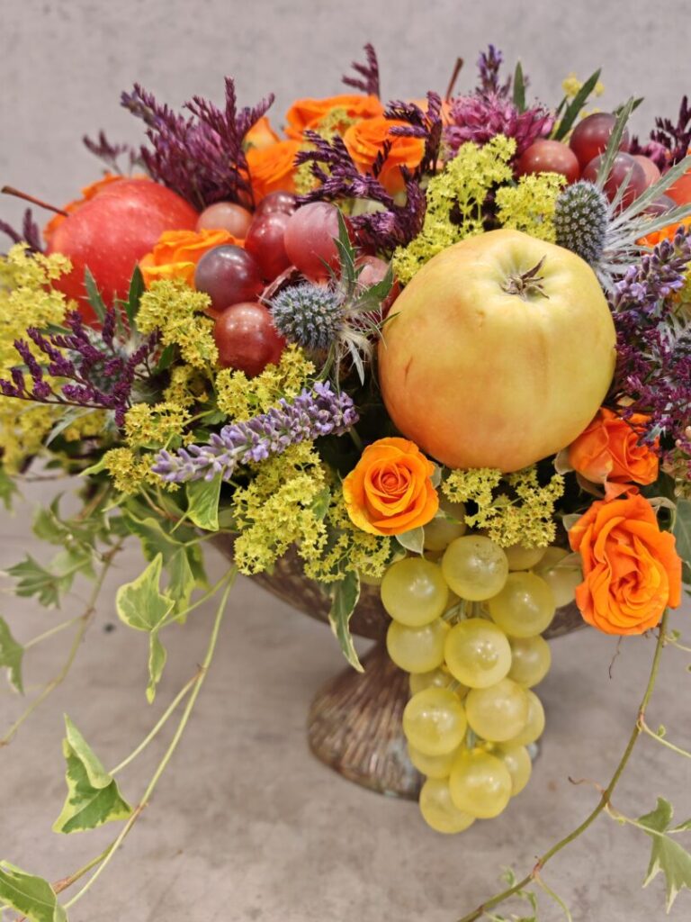 Dominantou aranžmánu je patinovaná čaša s historizujúcim tvarom, ktorá nesie bohatú kompozíciu kvetov a plodov. V aranžmáne sa spájajú Rosa, Alchemilla, Limonium či Eryngium so sezónnym ovocím ako sú jablká a hrozno. Kompozíciu nielen zjemňuje ale aj dodáva renesančný nádych padavá Hedera. Doplnkom je drobný vtáčik ako symbol prírody. Celok evokuje neskoré leto – obdobie hojnosti, zrelosti a pokojného doznievania. Aranžmán pripravila Nina Bročková z veľkoobchodu CUREL.