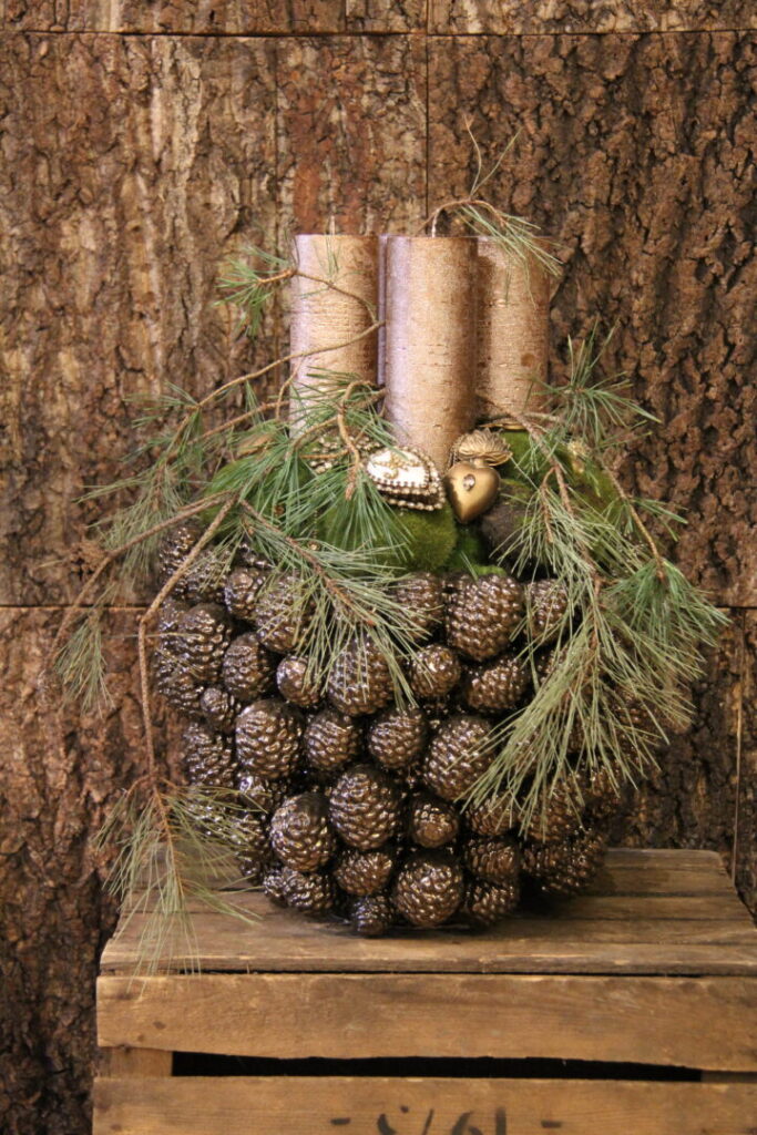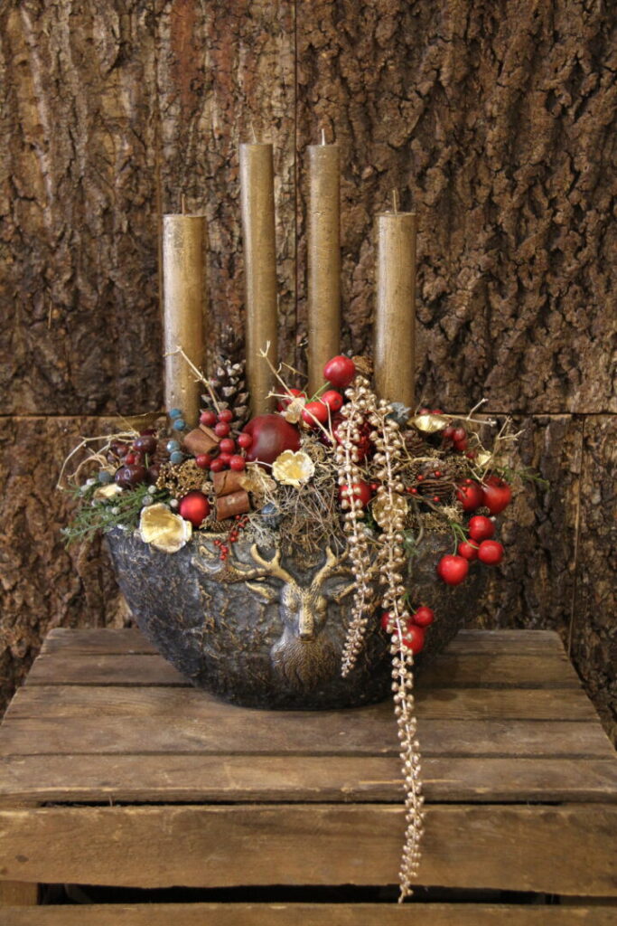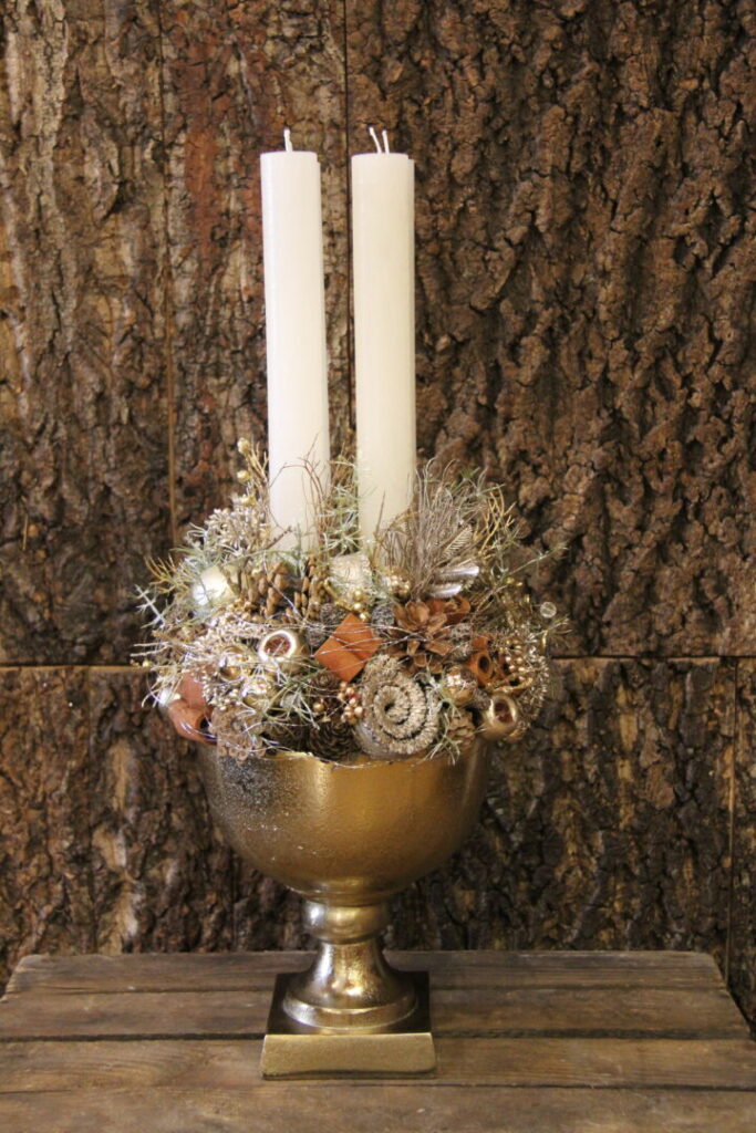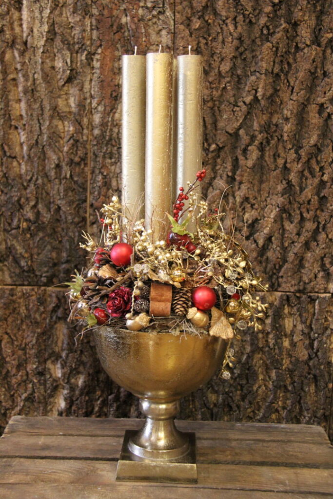 Zlaté a perleťové tóny dodávajú kompozíciám slávnostný charakter, zatiaľ čo prírodné prvky – konáriky, šišky, mach či sušené plody – vnášajú do priestoru jemnosť a autentickosť. Niektoré aranžmány pôsobia luxusne a majestátne, iné zas pripomínajú ticho zimného lesa. Spolu vytvárajú kolekciu, ktorá dokáže osloviť milovníkov klasiky aj nadčasového moderného dizajnu.