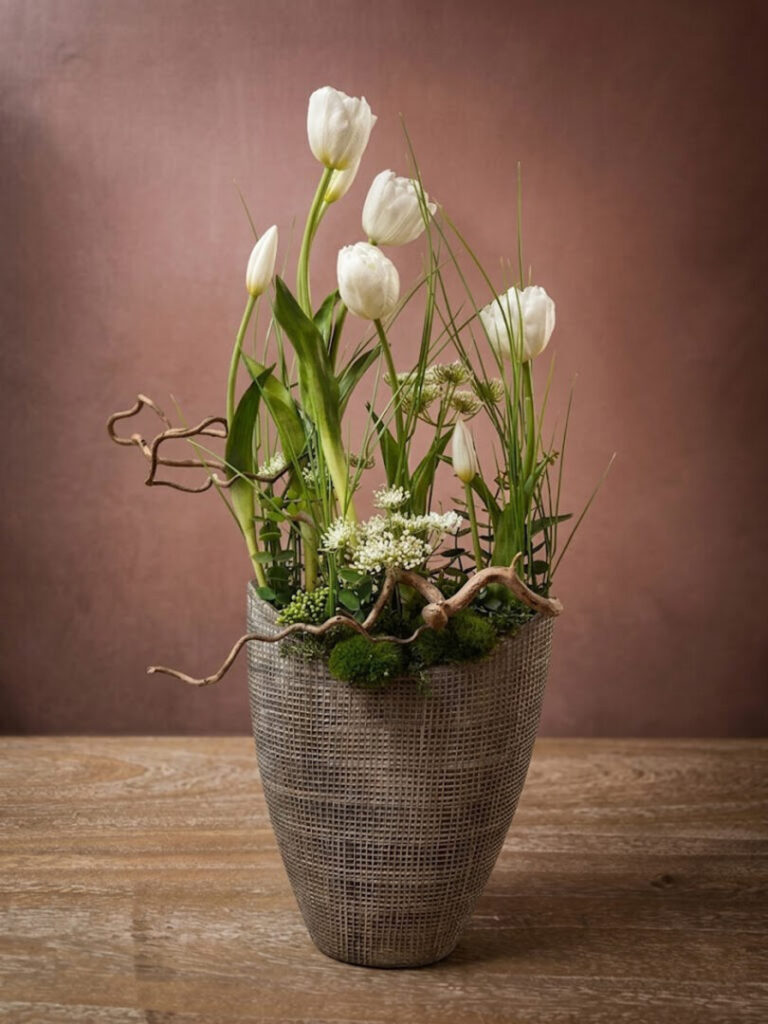 Prvé aranžmány, ktoré máme možnosť obdivovať, sú minimalistické, no zároveň výrazné. Biele tulipány sa vzpriamene týčia nad jemnou zelenou výzdobou a dopĺňajú ich krehké biele kvety, ktoré dotvárajú celkovú kompozíciu. Efekt dodávajú ohnuté vetvičky a mach, ktoré prinášajú do aranžmánu prvok prírodnej divokosti a dynamiky. Tento typ aranžmánu je ideálny pre milovníkov čistých línií a minimalistického štýlu, kde každý detail má svoj význam.