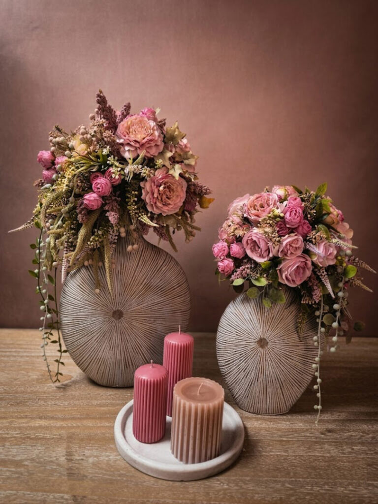 Druhá fotografia prináša kontrast – bohatú farebnú paletu a romantickú formu. Ružové ruže a kvety v odtieňoch pastelovej ružovej a fialovej vytvárajú dojem luxusu a hrejivej elegancie. Textúra keramických vázičiek, do ktorých sú kvety zasadené, pridáva do aranžmánu zaujímavý vizuálny prvok a zároveň podčiarkuje jemnosť kvetov. Dokončenie atmosféry prinášajú sviečky v pastelových odtieňoch, ktoré dodávajú kompozícii intimitu a príjemný domáci pocit. Takéto aranžmány sú ideálne na dekoráciu obývačky, jedálne alebo ako darček pre blízku osobu.