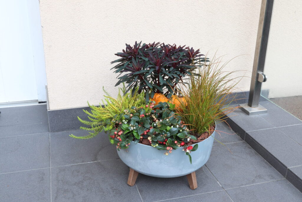 Zadání: Přání zákazníka – podzimní výsadba do přinesené nádoby k umístění ke vchodovým dveřím do domu. Cenová hladina do 1000 Kč. Objednávka byla předem konzultována telefonicky jeden den dopředu.