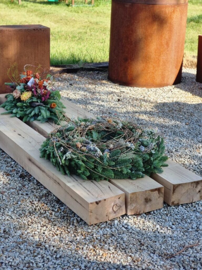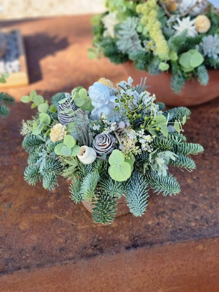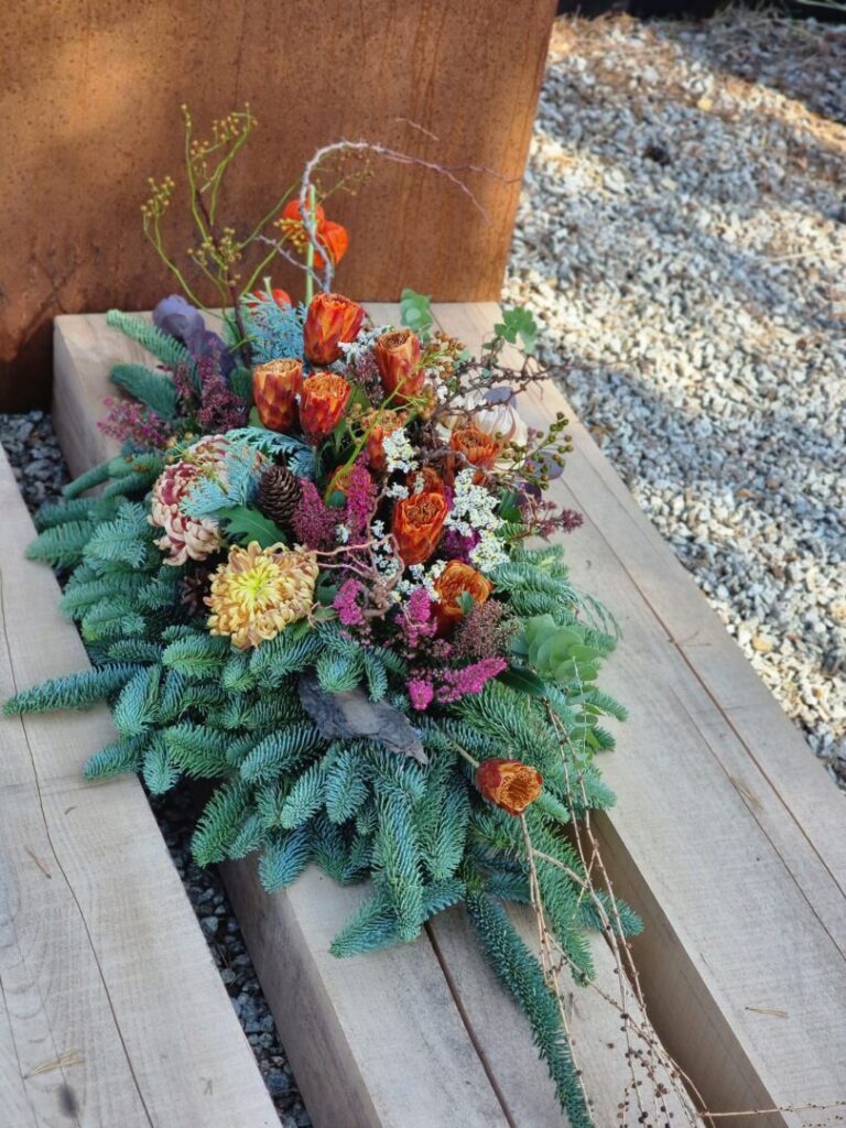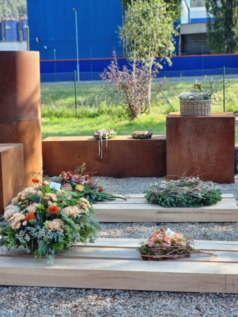Jednou z tém workshopu boli prírodné Dušičky – aranžmány s hlbším rozmerom, vytvorené zo živých halúzok, machu, konárov a kvetov. Silvia Pavúrová predstavila moderný a pritom ekologický prístup k tvorbe spomienkových aranžmánov, ktoré prinášajú nielen estetický, ale aj hlbší rozmer – spojenie s prírodou a udržateľnosť.
