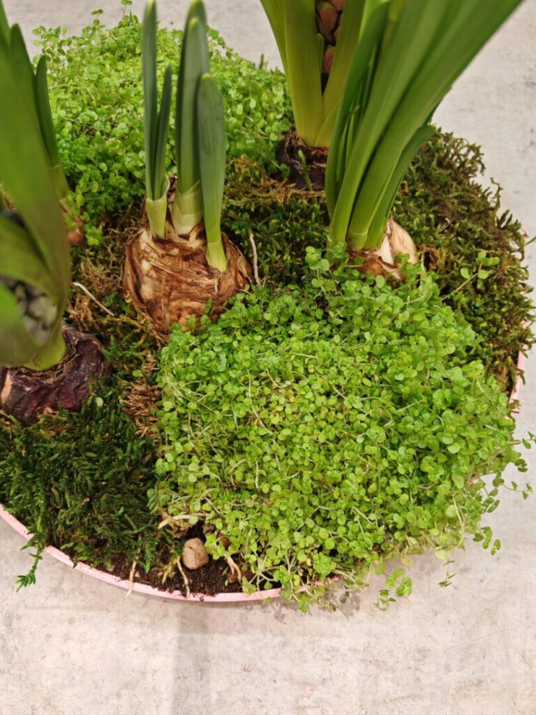Rastliny v podnose sa prirodzene podopierajú navzájom, čím si zachovávajú stabilitu. Machom zároveň spevňujeme okraje aranžmánu.
