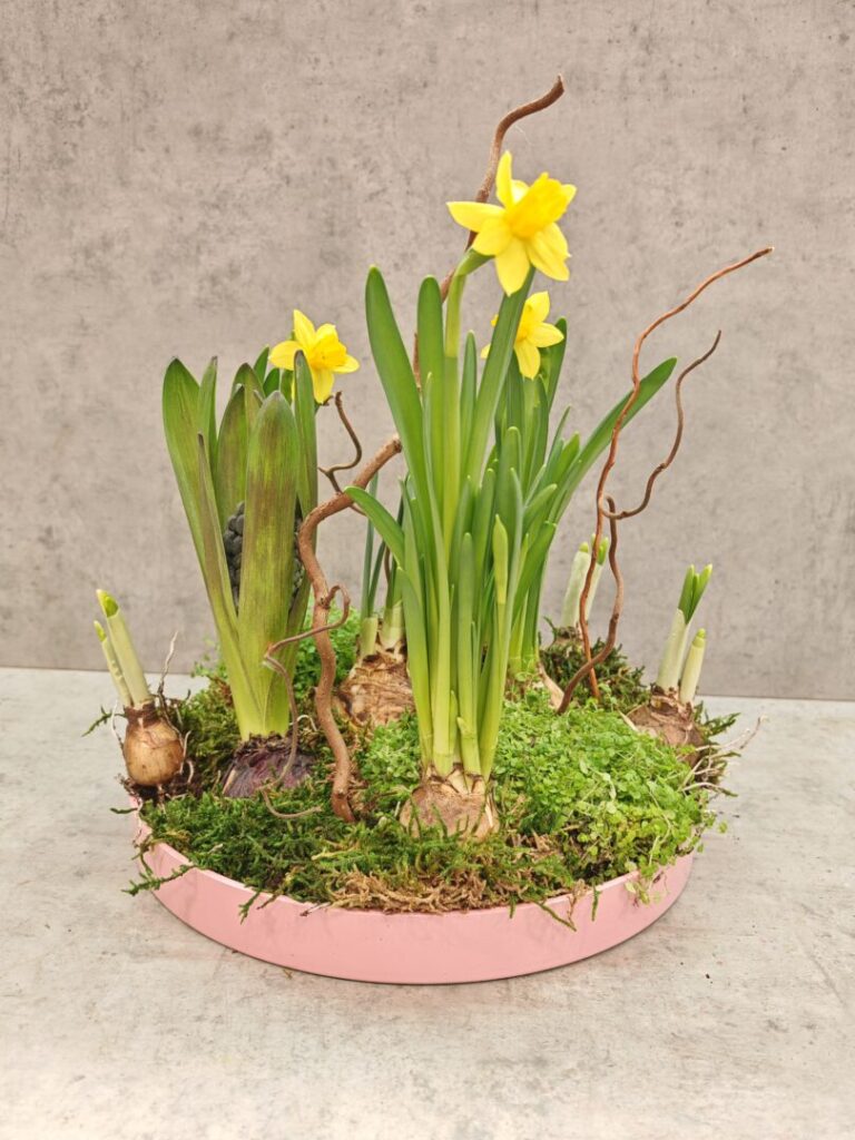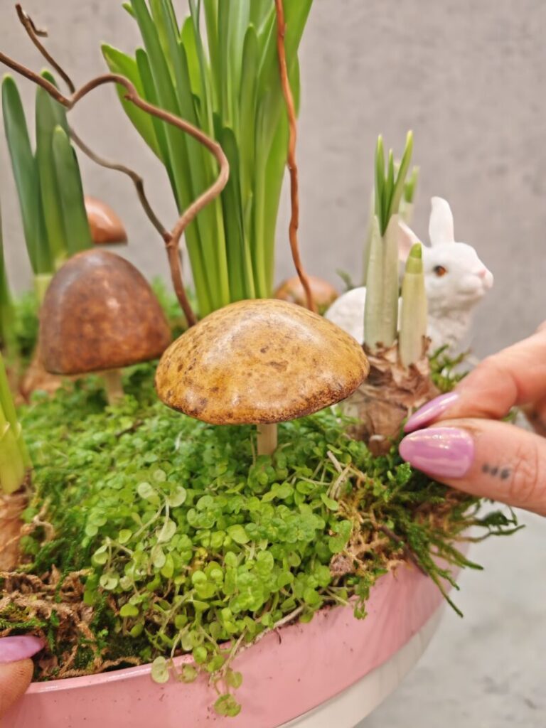Táto jarná dekorácia na podnose z dielne floristky Niny Bročkovej z veľkoobchodu CUREL zaujme svojou hravou kombináciou Narcissus a Muscari, bielych zajačikov a machu, ktorý vytvára dojem rozprávkovej lúky. Medzi rastlinami sa nachádzajú aj jemné detaily, ako malé huby a zakrivené vetvičky Salix erythroflexuosa, ktoré aranžmánu dodávajú hĺbku a navodzujú prirodzený, lesný nádych. Celkový efekt pôsobí sviežo, hravo a harmonicky.