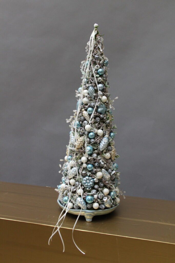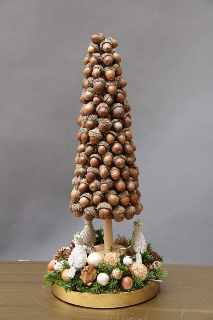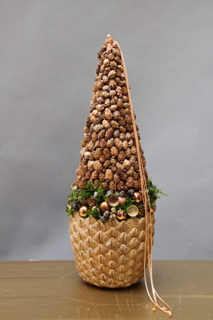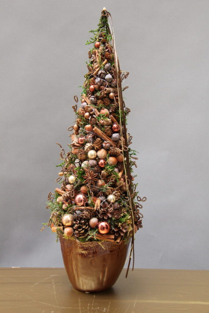 KIužeľové stromčeky sú vytvorené výhradne z prírodných materiálov. Sú vyskladané z drobných šišiek, žaluďov, mini orieškov, bobúľ, machu a ďalších lesných plodov, ktoré spolu vytvárajú bohato štruktúrovaný povrch. Prírodné odtiene dreva, hnedej, zelenej a machovo mäkkej textúry dopĺňajú jemné metalické akcenty, ktoré zvýraznia sviatočnú atmosféru bez toho, aby potlačili prirodzenosť celku. Tieto stromčeky pôsobia teplo, autenticky a elegantne – sú ideálnou voľbou pre tých, ktorí túžia po vianočnej výzdobe, ktorá nepôsobí umelo, ale prináša do interiéru kúsok lesnej atmosféry. Vďaka starostlivému vrstveniu materiálov pôsobí každý stromček ako precízna ručná práca s výrazným dekoratívnym efektom.*