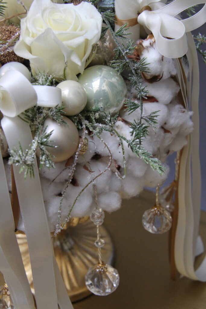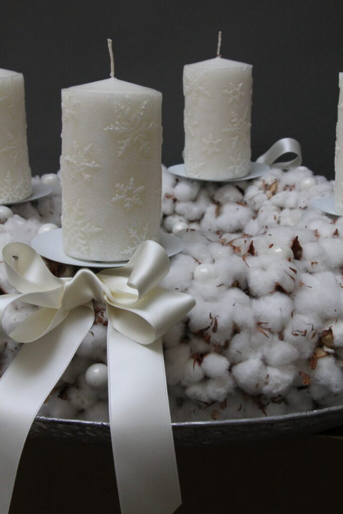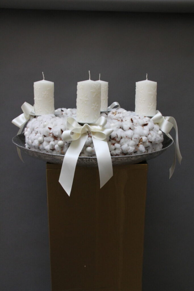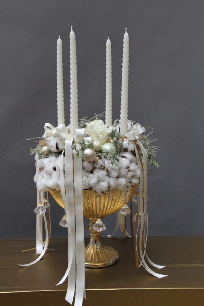 Tu sa mäkkosť bavlny kombinuje s pevným, luxusným zlatým kovom. Adventný svietnik so štyrmi vysokými špirálovými sviecami je ukážkou precízneho balansovania medzi bohatou výzdobou a čistotou kompozície. Zlatá nádoba zdobená kryštálovými závesmi dodáva aranžmánu noblesu, zatiaľ čo prírodné prvky, ako halúzky ihličia a jemný shimmer, odkazujú na tradičnú zimnú estetiku.*