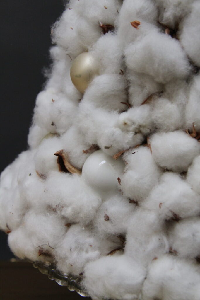 V kolekcii nájdeme výrazný prvok v podobe snehovo bieleho stromčeka, tvoreného z množstva bavlnených toboliek doplnených perličkami. Tvarovo čistý kužeľ stojaci na sklenenom podstavci pôsobí ľahko, elegantne a zároveň neprehliadnuteľne. Ide o dekoráciu, ktorá dokáže byť dominantou moderného interiéru aj jemným doplnkom klasického priestoru.